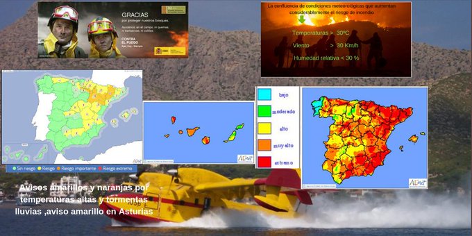 25Julio Mapa de niveles de riesgo de #IIFF niveles muy altos en la mayor parte de la #Península , #Baleares y #Canarias Avisos por temperaturas
